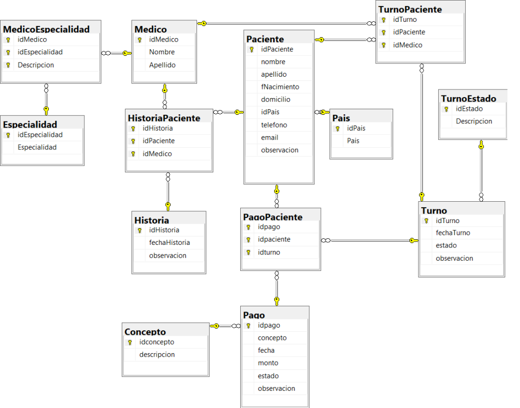 idpago,concepto,fecha,monto,estado, yobservacion. - PagoPaciente: Relaciona pagos con pacientes y turnos, con claves como